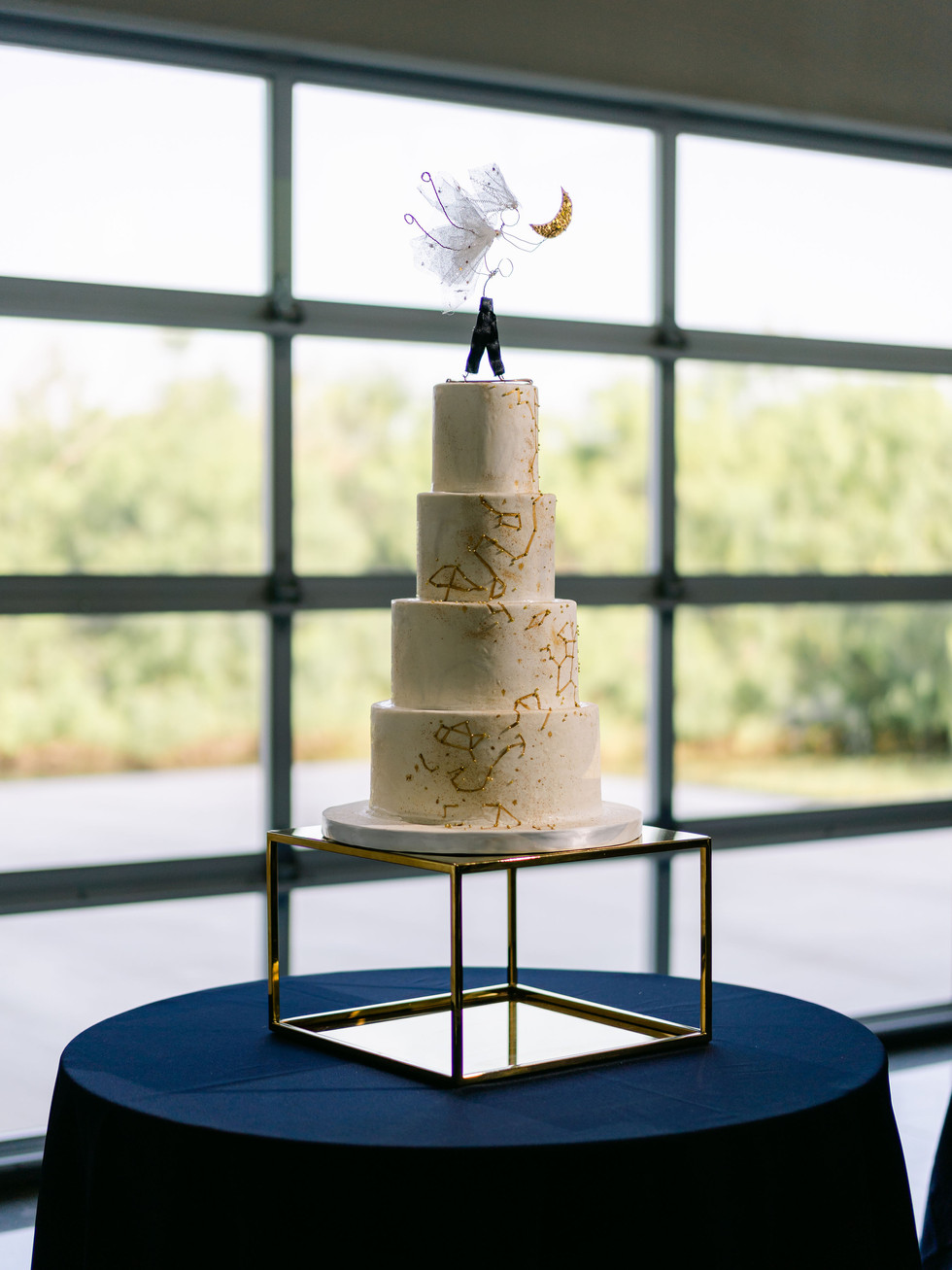 For their wedding cake, Amy and Gid wanted to recreate the night sky from their first date on the 12th of August. The lightly marbled tiers were accented with hand painted constellations along with gold dragées to place an emphasis on the brightest stars of each piece of sky art. Their cake was finished with a custom made topper created my Amy and her father.